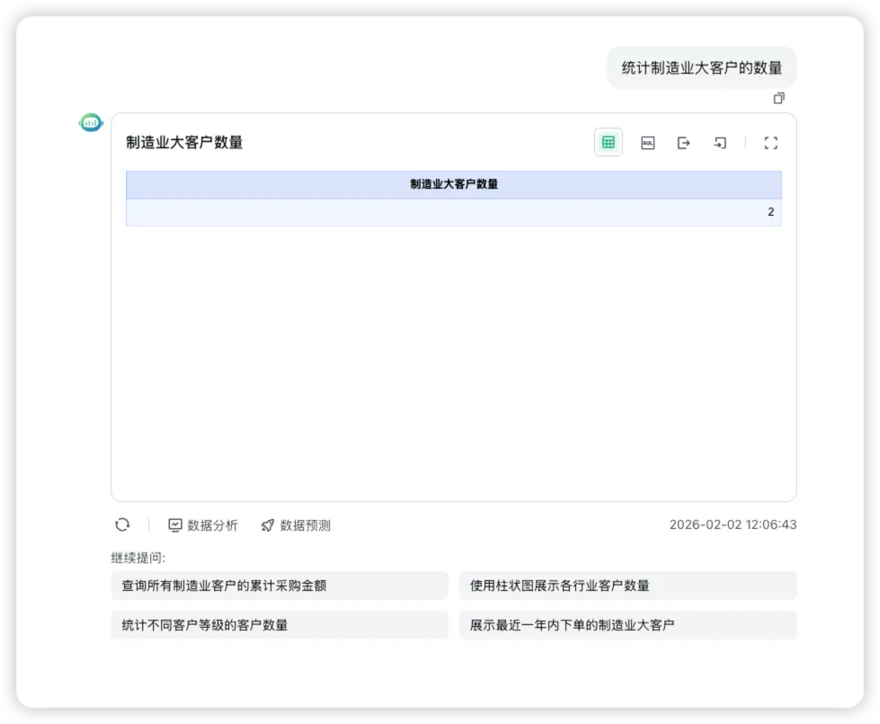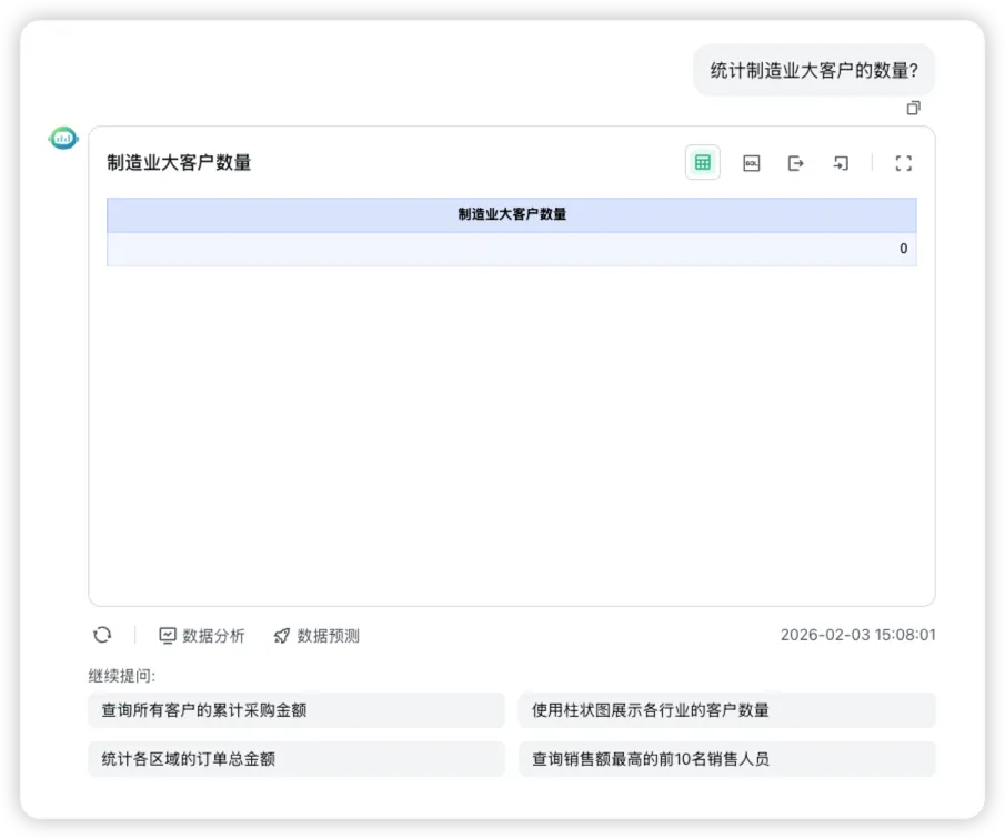 SQLBot使用以上SQL语句,在模拟电商CRM系统数据源进行查数后,对提问作出的回答如下,未能如实反映原数据中的“制造业大客户数量”。