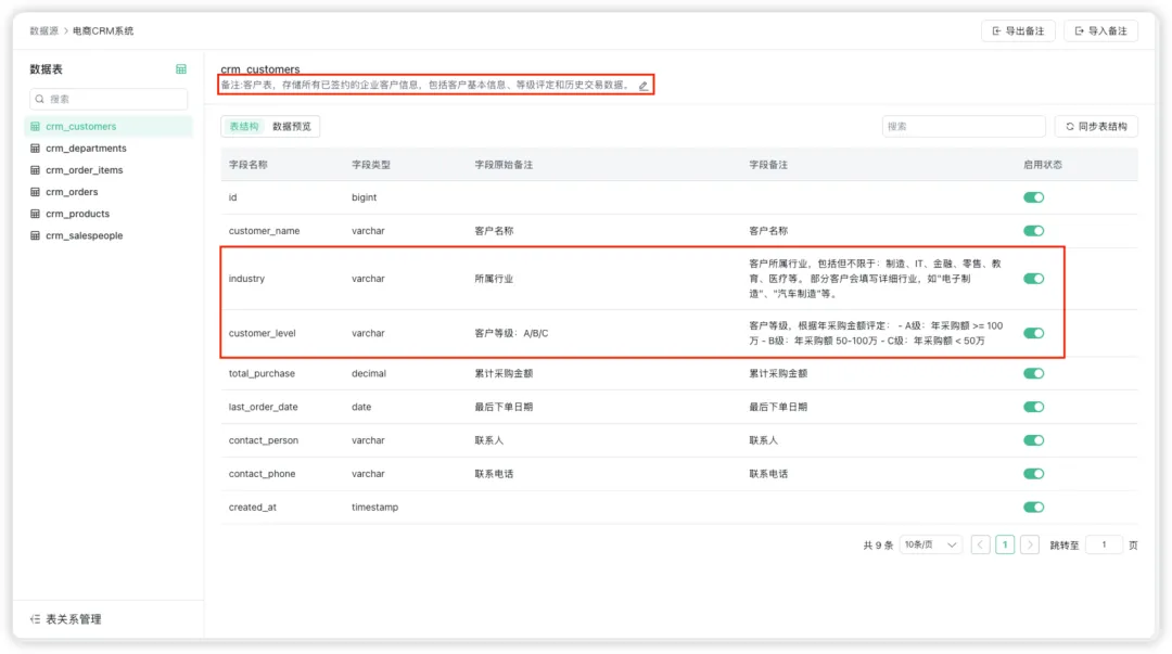 第一步:添加表和字段描述。让大模型理解在客户表crm_customers中,字段customer_level的数值对应客户等级的评级标准,以及字段industry包含对应客户所属行业的关键词范围。