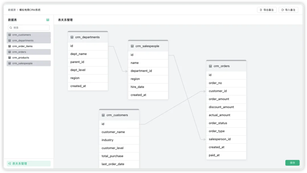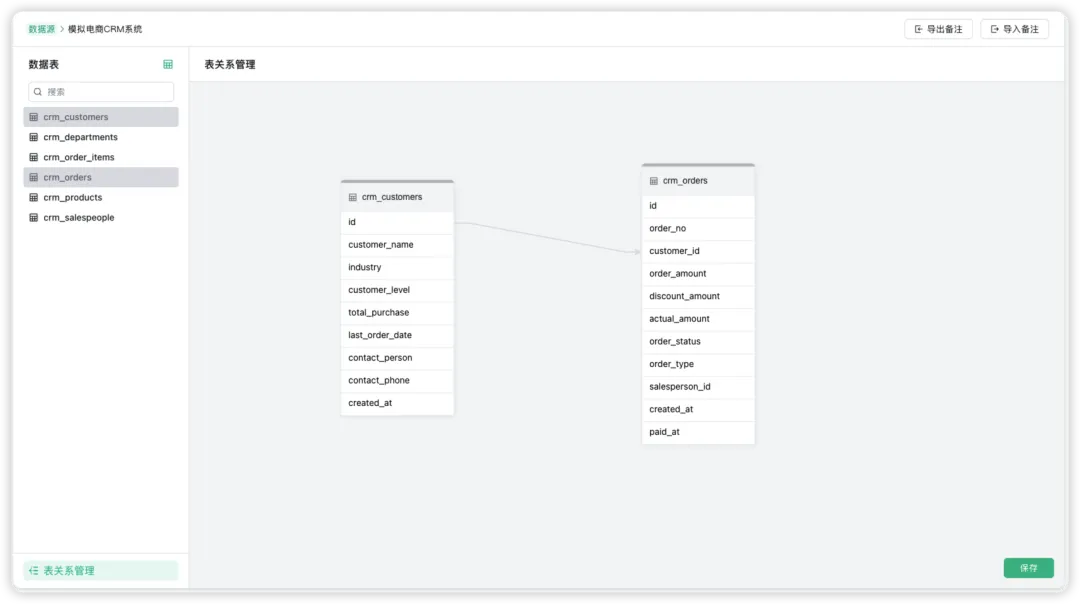 第一步:进行表关系管理。明确告诉模型,将表crm_customers和表crm_orders通过customers.id(客户表ID)和orders.customer_id(订单表中的客户表ID)字段进行关联,避免使用错误的字段进行JOIN,确保多表查询的关联逻辑正确。