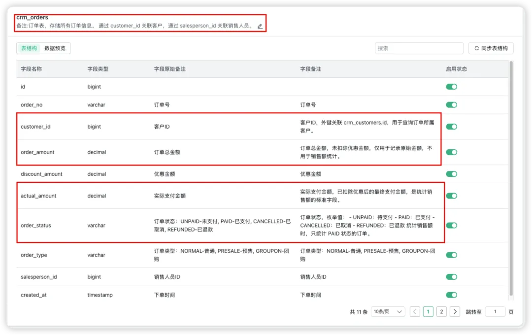 第二步:添加字段描述。说明customer_id字段表示客户ID,外键关联字段为customers表中的crm_customers.id;明确actual_amount字段为实际支付金额,是统计销售额使用的标准字段;order_status字段为订单状态,需要从中筛选出“PAID”(已支付)状态,便于模型选择正确的字段和条件。