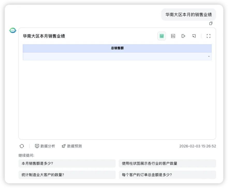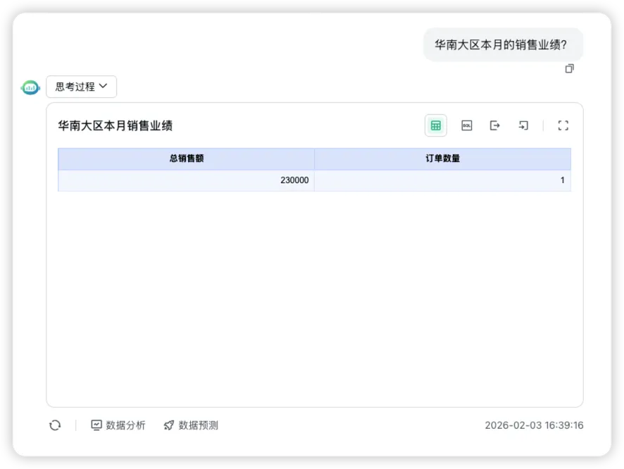 使用正确的SQL语句,SQLBot可以从数据源中查询出问题的正确结果,即正确的“华南大区本月销售业绩”数据: