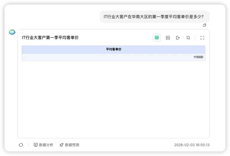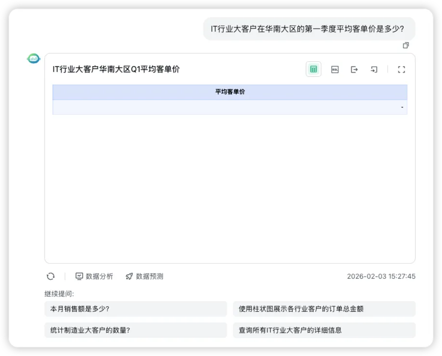 SQLBot使用以上SQL语句,在模拟电商CRM系统数据源进行查数后,作出的回答未能正确反映“IT行业大客户在华南大区的第一季度平均客单价是多少?”这一复杂查询的结果。