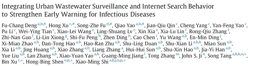 摘要:污水监测(Wastewater-based surveillance, WBS)已成为监测传染病的有效工具。然而,其更广泛的应用往往受到操作资源和数据复杂性的制约。在此,我们以新型冠状病毒肺炎(COVID-19)为案例,开发了一个将污水监测与中国领先的在线搜索查询平台——百度搜索指数(Research Index)协同整合的集成框架,以增强传染病的早期预警能力。在为期一年(2023年2月至2024年1月)的时间里,我们从中国南宁市的12座污水处理厂采集了1164份进水污水样本,并使用逆转录定量聚合酶链反应(RT-qPCR)对RNA进行了定量分析。我们计算了7天流量加权移动平均浓度(7-day flow-weighted moving average concentration, FWMAC),并将其与16项人群监测指标和126个百度搜索词进行了关联分析。值得注意的是,7天FWMAC比临床指标提前1–7天,并与多项流行病学指标呈现强相关性,包括报告病例数(决定系数R2=0.92)、发热门诊确诊数(R2=0.72)、发热门诊阳性数(R2=0.86)以及住院人数(R2=0.78)。我们采用分布滞后非线性模型(distributed lag nonlinear models, DLNM)来定义可操作的、具有临床意义的风险阈值。随后,我们识别出三个关键的百度搜索词(“二次阳性”、“新冠肺炎临床进展四阶段”和“布洛芬”)。其整合后的搜索指数提升了模型性能(发热门诊确诊数的 R2R2 从0.72提升至0.78,住院人数的 R2R2 从0.78提升至0.82)。在另外三个中国主要城市(长沙、厦门和南京)进行的外部验证进一步证实了该模型的稳健性和泛化能力,在随机森林模型中,R2 分别提升了36.4%、30.0%和4.9%。这一集成的“污水-数字”框架代表了一种变革性的、成本效益高的早期预警策略,可实现主动式的公共卫生响应。