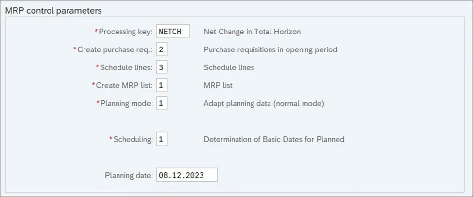 传统的MRP可以用不同的事务码执行,具体取决于所需计划的物料范围。但是,在所有这些事务码中,都可以找到MRP控制参数设置,可以使用这些参数来定义MRP运行的行为方式。下图显示了可以在传统MRP事务码中找到的MRP控制参数部分。第一个可用设置是Processing key 处理代码,当计划一个或多个工厂时,该设置在总计划运行中使用,并定义要选择哪些物料进行计划。SAP S/4 HANA 中提供了以下处理代码:- Net change in total planning 净变化计划(NETCH)