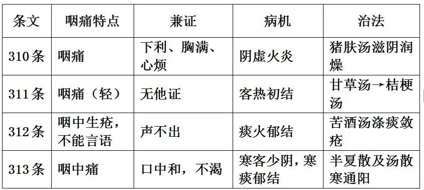 · 咽中痛:与前三条之咽痛相较,本条咽痛当为寒证: