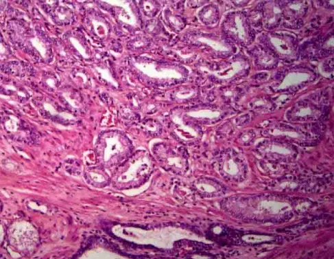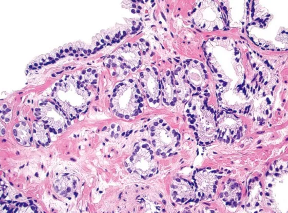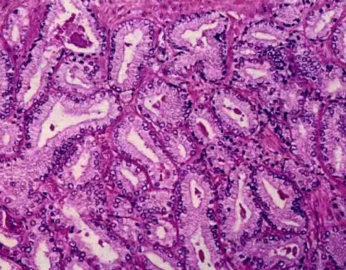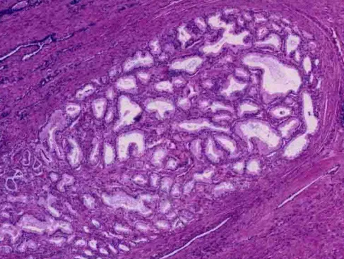 Gleason2级:与Gleason1级相似,肿瘤结节边界比较清楚,但边缘可有微小浸润。与Gleason1级相比,2级的腺体排列较为松散,腺体大小形态较不一致,腺体圆形、卵圆形,不融合。1级及2级癌大多发生在移行区,很少位于外周区。