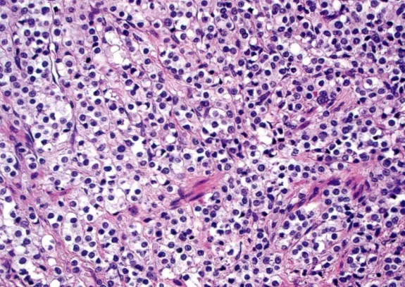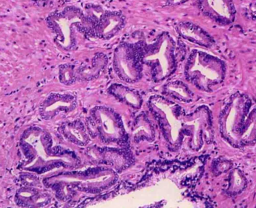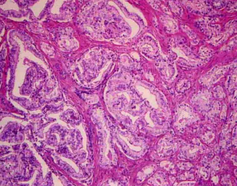 Gleason1级:肿瘤结节界限清楚、膨胀性生长,结节内腺体排列紧密但不融合,圆形、卵圆形中等大小(比Gleason3级的腺体大),大小形状均一致,不浸润周围良性前列腺组织。