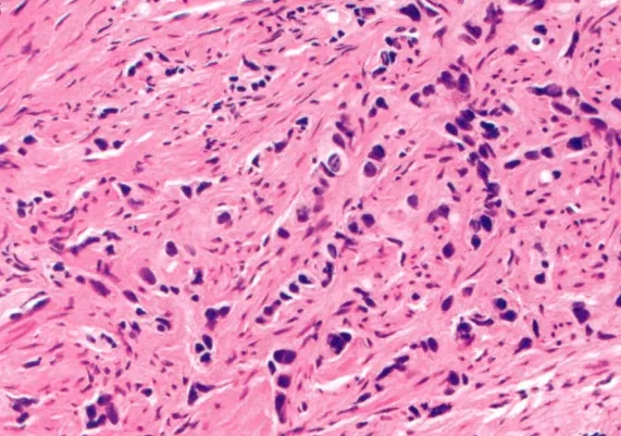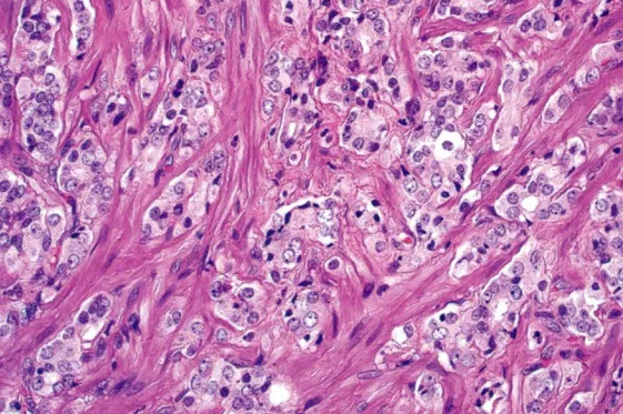 Gleason4级,显示分化欠佳的腺体,可见簇状细胞及条索状结构,提示腺体形成,但大部分缺乏确切的腺腔