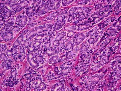 轻度不规则形态的腺体形成界限清楚的小叶
