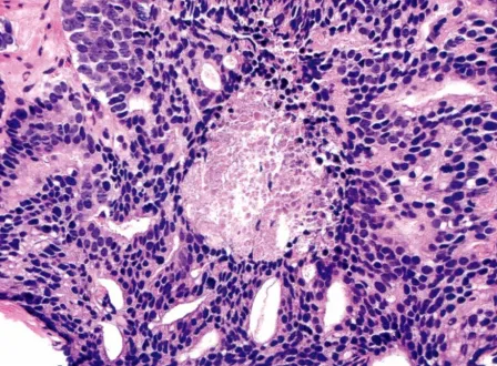 前列腺腺癌伴粉刺状坏死被认为是5级,然而最近发现这些病灶往往是导管内癌。由于目前的观点认为导管内癌不应被分级,因此如何处理这些病例是存在争议的。