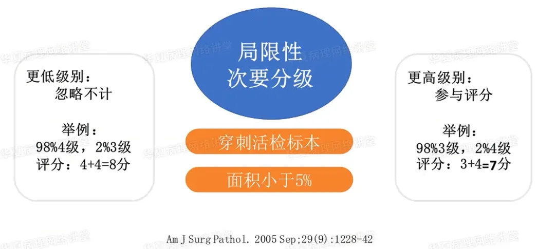 穿刺活检及经尿道切除标本中,肿瘤成分为2种且次要成分肿瘤比例<5%时,①当次要成分级别比主要成分低时,次要成分级别可忽略不计,Gleason评分=主要+主要,如上图例子98%4级,2%3级,3级可以忽略不计,Gleason评分4+4=8分。②当次要成分级别比主要成分高时,要参与评分,Gleason评分=主要+次要,如主要成分98%4级,2%5级,Gleason评分4+5=9分。