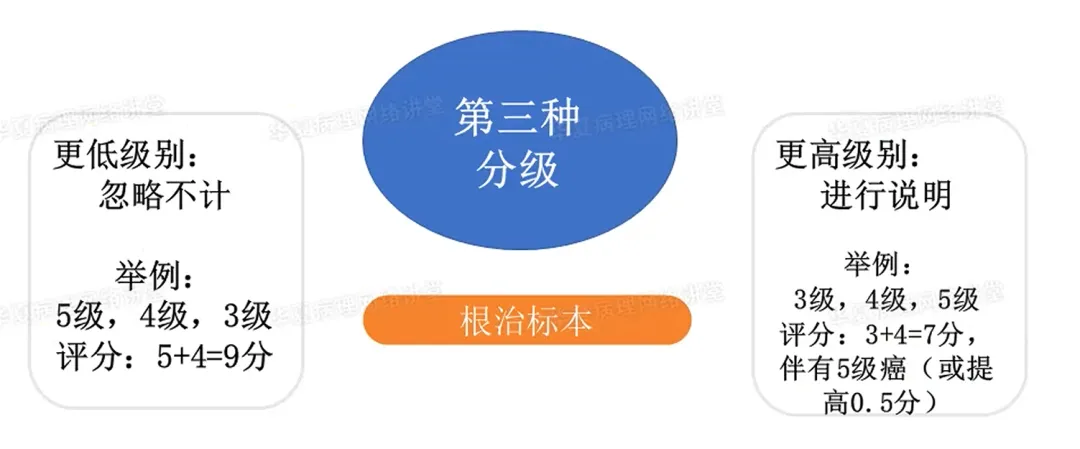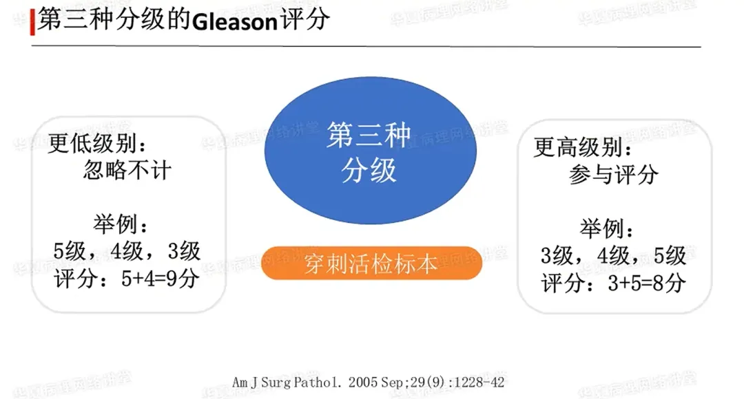 ①第3种成分级别更低时,可忽略不计。如3种成分,主要是5分,次要4分,第3种成分3级,则忽略3级成分,Gleason评分=主要+次要,5+4=9分。