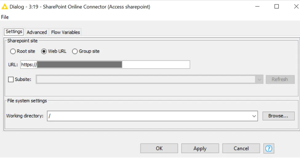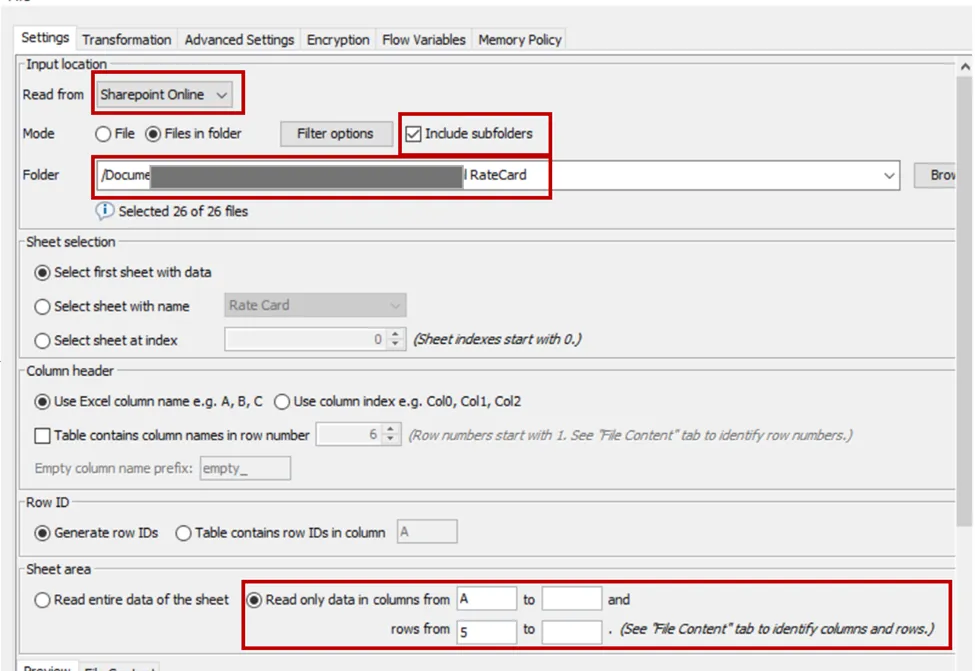 文件读取选择Sharepoint online,因为还有历史的报价表在子目录中,因为有可能跨月份跨年运输,不同订单对应的不同时期的价目表,所以,勾选include Subfolders,输入你的读取的目录,如果目录正确,下面会显示一共有多少文件。你也可以点开Filter Options输入筛选条件只选择你想要的文件
