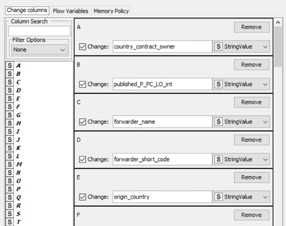 因为每个表的表头有些不同,所以,我用Column Rename这个Node修改表头。这个node很简单,左面,选择对应的字段,然后在右面直接定义名字和字段类型。