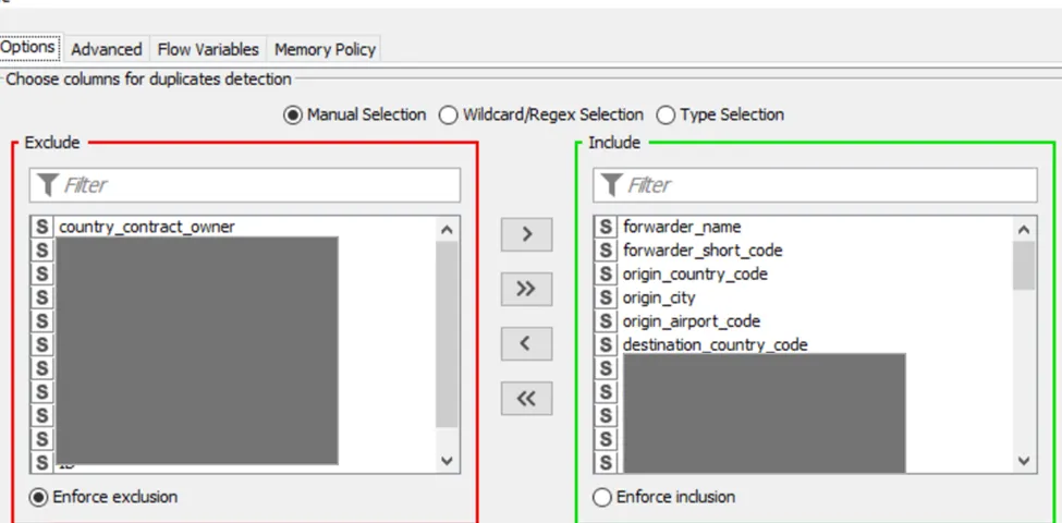 因为不同版本的报价单可能有重复的数据,我们先剔除重复项,这里用 Duplicate Row Filter,根据自己的需要,选择相应的字段,将不需要的字段放到左面,需要的字段放右面,这样,重复项就可以剔除了