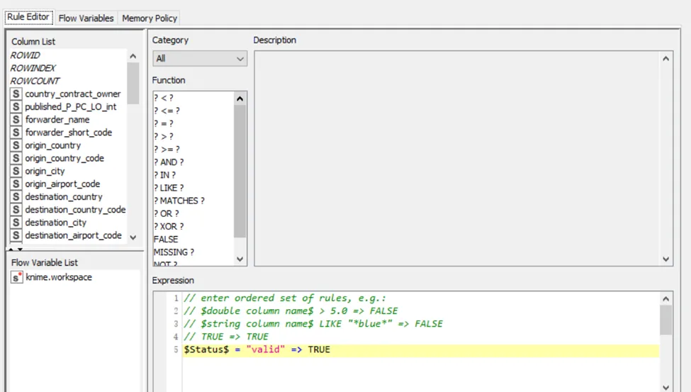 剔除重复项之外,我们需要只选择状态是valid的价格,这里我们用Rule-Bsed row filter选取相关的项目,在下面express框里面输入$Status$ = "valid" => TRUE,