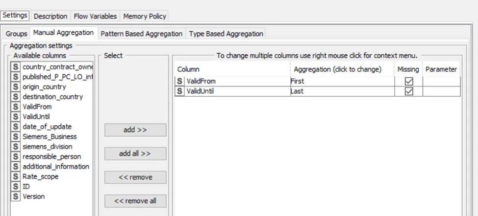 先选择需要进行group的字段,然后在manual Aggregation里面设置选择validfrom的第一个,和validuntil的最后一个,这样,一个价格,你只有一行,合并了所有相同价格日期不同的价目。当然前提是我们所有的valid日期是连续的。