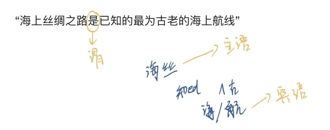 :句子成分分行错落记录,主语左、谓语中、宾语右,形成对角线,清晰体现句子结构(如 “海上丝绸之路是最古老海上航线” 按主 - 谓 - 宾左中右分行)。