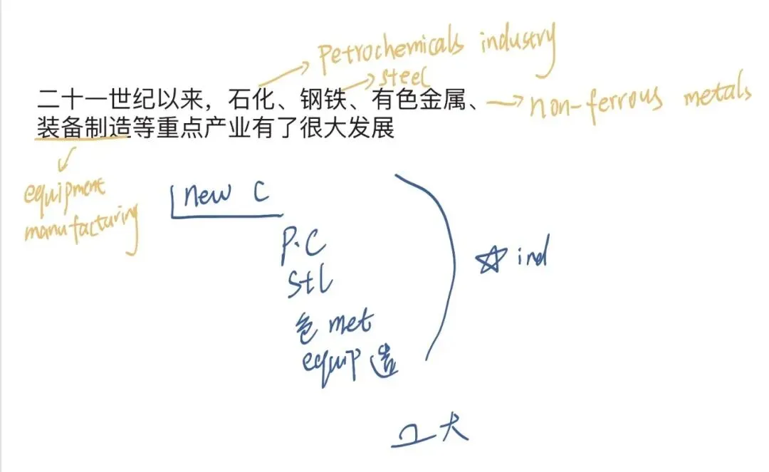 :记录同类列举内容时,垂直排成一列并加大括号,避免与前后内容混淆(如列举石化、钢铁等产业时用此方法)。