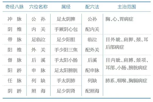 ·针对其主治病症,每一次取一对穴位。如心、胸、胃有病时可取内关、公孙;肺系、喉咙、胸膈病症时可取列缺、照海;余类推。