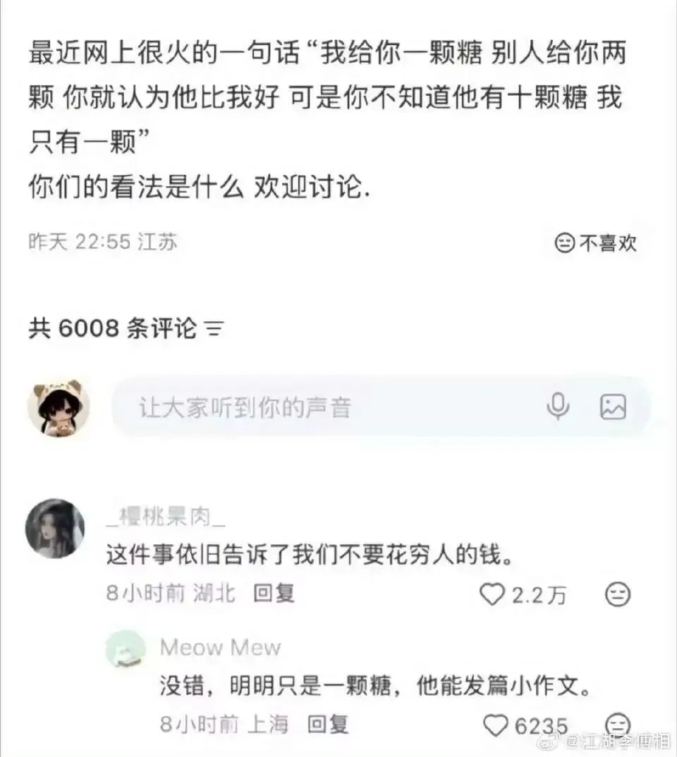 你遇见对的人,他想追你,就会让“利”。只有那些普信男,才不会反问你。为啥要我请你吃饭,为啥你不请我吃饭?
