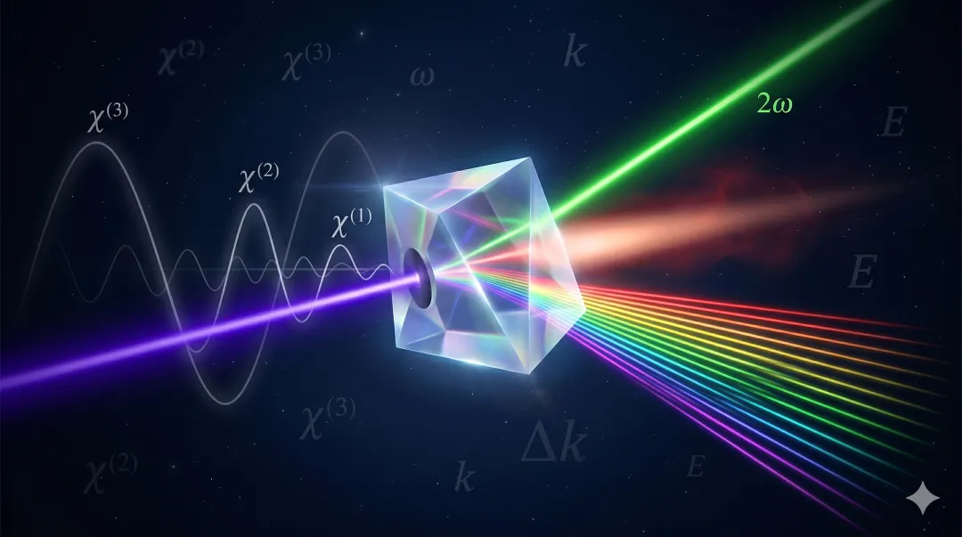 χ⁽²⁾项对应极化强度中的E²——两个电场相乘。由于不同频率的光场可以组合,E²意味着两个光子可以通过非线性极化耦合在一起,产生一个新频率的光子。所有涉及三个光子相互作用(三波混频)的过程,其底层机制都是χ⁽²⁾。