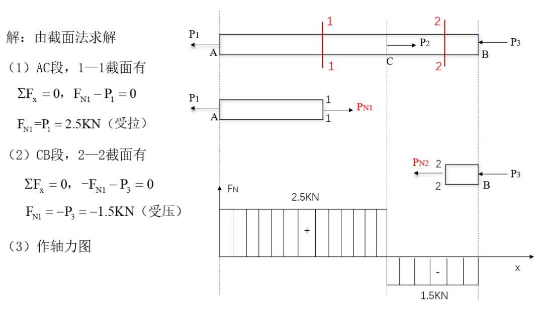 内力是物体内相邻部分之间的相互作用力,为了显示内力,可应用截面法。以实例说明如何求解轴力与轴力图。例:图示杆件,P1=2.5KN,P2=4KN,P3=1.5KN,求AC段、CB段内力,并作其轴力图。基于拉压平面假设:变形后,内部任意横截面仍保持平面,且仍与杆轴垂直,只是横截面间沿杆轴相对平移。可知,杆件任意横截面上各点沿轴向变形相同横截面,各点有相同的正应变,没有切应变。设拉杆的原长为l,承受一对轴向拉力F的作用而伸长后,其长度增为l1,则杆的纵向伸长为Δl=l1 - l。
