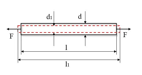 拉杆在纵向变形的同时将有横向变形。设拉杆为圆截面杆,其原始直径为d,受力变形后缩小为d1,则其横向变形为Δd=d-d1,在均匀变形情况下,拉杆的横向线应变为ε’=Δd / d。