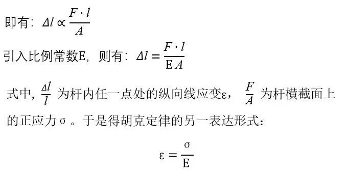 拉(压)杆的变形量与其所受力之间的关系与材料的性能有关,只能通过实验来获得。对工程中常用的材料,如低碳钢、合金钢所制成的拉杆,由一系列实验证明:当杆内的应力不超过材料的某一极限值,即比例极限,杆的伸长Δl与其所受外力F、杆的原长成正比,而与其横截面面积A成反比。