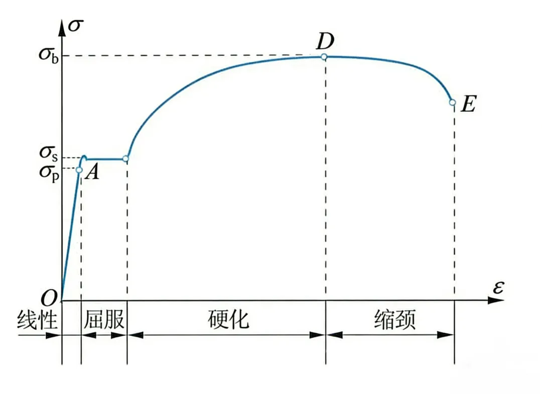 下图为低碳钢Q235的应力-应变图,现以该图为基础,介绍整个拉伸过程中,材料经历的线性、屈服、硬化与缩颈四个阶段。