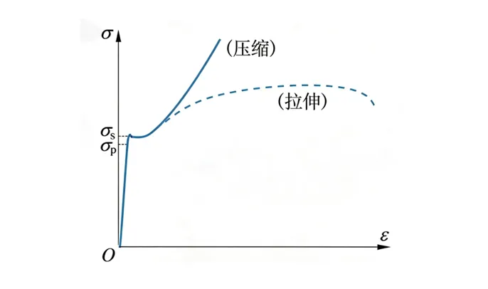 下图为低碳钢压缩时的应力-应变曲线,其中虚线为拉伸时的应力-应变曲线。在屈服之前,压缩曲线与拉伸曲线基本重合,压缩与拉伸时的屈服应力、弹性模量均大致相同。