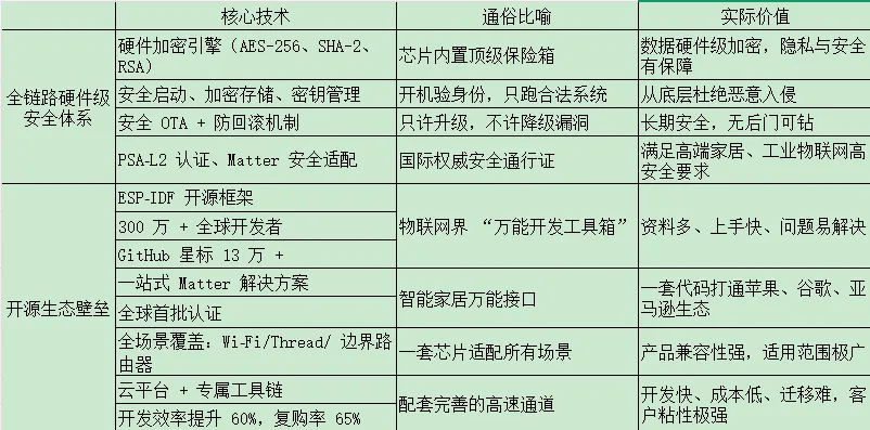 以前IoT 芯片都被 “ARM 收租” ,成本高且被卡脖子。乐鑫彻底跳出了ARM架构的授权枷锁,实现从IP核、SoC到指令集的全栈自研。是RISC-V架构在物联网领域最成功的商业化推动者之一。在中美科技博弈背景下,自主可控的指令集架构具有极高的战略估值溢价。通用的 RISC-V 内核性能平庸,乐鑫针对物联网场景,从IP 核→芯片设计→指令集全栈自研对其进行了深度魔改。如果说ARM架构像是“通用西装”,谁穿都行,但未必最合身。 乐鑫的做法是量体裁衣。让芯片干起活来更专注、更省电、效率更高,而不是像通用芯片那样“大材小用”或“力不从心”。(2)乐鑫根据 IoT 设备对低功耗、小面积的极致需求,自定义了指令集。乐鑫自研的 RISC-V 内核面积仅为同类 ARM 芯片的 70%,在同等晶圆成本下,乐鑫芯片能集成更多功能或做到更小封装。IoT行业长期被协议割裂困扰,Wi-Fi、蓝牙、Thread、Zigbee、Matter等多种协议各行其道,以前的方案是在设备里塞进多颗不同的芯片,一颗负责Wi-Fi,一颗负责蓝牙,一颗负责Zigbee等。这必然导致设备个头大、成本高,而且多芯片组合,不仅拉高成本,还占用设备空间、降低稳定性。乐鑫造出了一个精通所有语言的“超级大脑”——SoC。这一颗芯片就能同时听懂并流利使用Wi-Fi、蓝牙、Thread、Zigbee、Matter这五种“语言”。一颗芯片打通全协议。仅此一颗芯片,直接降本30%,且周围的电路板、天线、外壳都能做得更小更简单还具备高稳定性。 对于厂家来说,造产品更便宜、更简单、更小巧; 对于用户来说,买回家的智能设备反应更快、更省电、不管什么品牌都能连在一起用。 这就是为什么乐鑫能成为智能家居和可穿戴设备首选方案的原因——它用最简单的硬件,解决了最复杂的连接问题。(3)超低功耗设计:IoT设备大多依赖电池供电,低功耗是核心刚需,乐鑫在功耗优化上做到了行业顶尖水平。其芯片待机功耗可低至 5μA 级别,相比同类竞品节能 40% 以上,极大地延长了电池供电设备(如智能门锁、传感器)的寿命。乐鑫的BLE Mesh/802.15.4 Mesh深度优化技术有点像"传话游戏"或"接力赛”。设备A离路由器远,但它不需要大声喊(高功耗),它只需要小声告诉旁边的设备B,设备B再传给C,最后传到路由器。 这样每个设备只需要用很小的力气(低功耗)就能完成通信,整个网络覆盖范围还特别大。无论是家里的智能灯泡,还是工厂里的温湿度传感器,都能连接成一张紧密的大网。(4)乐鑫的聪明之处还在于除了全新架构,也仍然保留成熟的Xtensa老架构,解决兼容的问题。(5)乐鑫的 ESP32-C6 成为全球首款获得 PSA Certified Level 2 认证的 RISC-V 芯片,证明了其在安全架构上已达到国际顶尖水平,消除了市场对开源架构安全性的顾虑。 乐鑫让设备变成了“铜墙铁壁”,专门满足那些对安全极其挑剔的场景(如智能门锁、工厂控制)。AIoT的核心在“智能”,但多数IoT芯片受制于算力,只能依赖云端处理,延迟高、隐私性差、网络依赖性强。乐鑫的高性能芯片 ESP32-P4 采用了双核 RISC-V 架构,主频高达 400MHz,并配备了独立的 AI 加速指令集,能够流畅运行轻量级大模型和复杂的图形界面,打开了人形机器人、智能玩具、工业预测性维护等高端市场空间。乐鑫避开高通、联发科主导的路由器、手机芯片红海,专注细分IoT终端市场,走出“巨头看不上、小厂做不了”的专属赛道。凭借硬核技术与生态优势,乐鑫拿下Wi-Fi MCU全球市占率第一,连续七年领跑,累计芯片出货量突破15亿片,供应链与成本优势显著。大 Wi‑Fi 市场份额位列全球前五,是大陆地区唯一进入前五的芯片企业。乐鑫全软硬件协同,覆盖从芯片内核(RISC‑V 自研 IP)、操作系统、AI 工具链到云端连接的全链路,毛利率长期稳定在45%以上,远超同行,盈利能力与技术壁垒形成双重保障,成为AIoT芯片领域难以被替代的隐形冠军。四、生态壁垒:全球开发者社区与开源项目形成强网络效应,竞争对手难以短期复制。