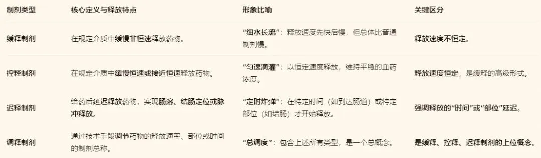 (1)概念区分:“缓释非恒速,控释恒速出,迟释玩延迟,肠结脉溶加脉冲。”