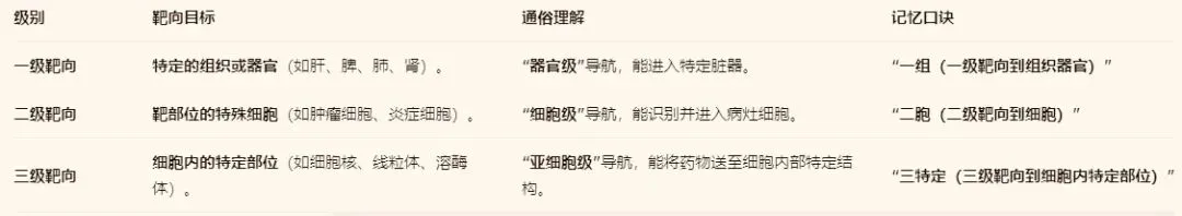 3.理解“靶向级别”的递进关系:从组织到细胞再到细胞内,是一个由粗到精的递进过程。