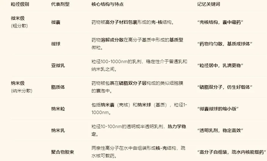 2.建立“粒径-体系”联系:看到“微米级”想到微囊/微球(粗分散),看到“纳米级”想到脂质体/纳米粒(纳米分散)。