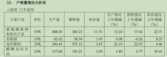 新能源新材料相关产品销售量比上年增加17.64%,化学肥料销售量比上年增加22.07%。