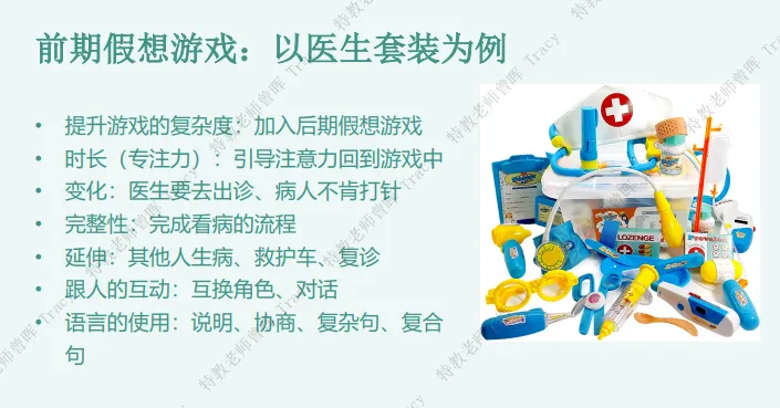 假想游戏的发展: 区分前期假想(以具体物品为主,角色意识弱)和后期假想(想象力丰富,角色有主体意识),这是游戏能力发展的关键标志。