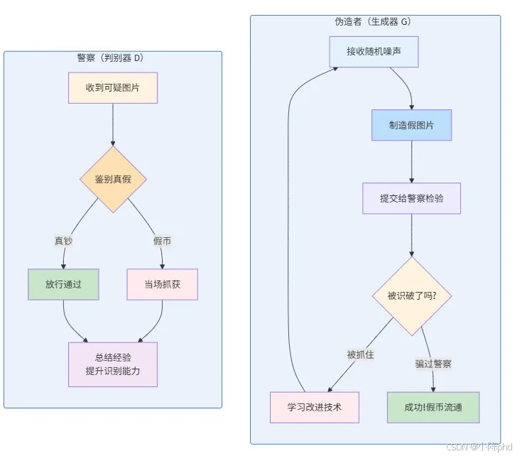 - • 伪造者(Generator):试图制造假币,希望骗过警察
