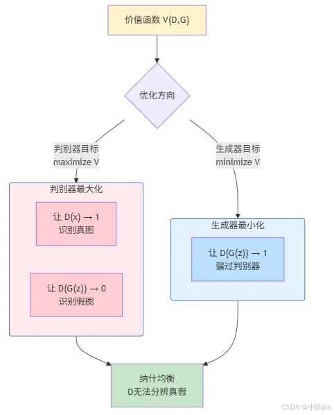 - • 生成器 G 希望最小化 V:让 D(G(z)) 接近1(骗过判别器)