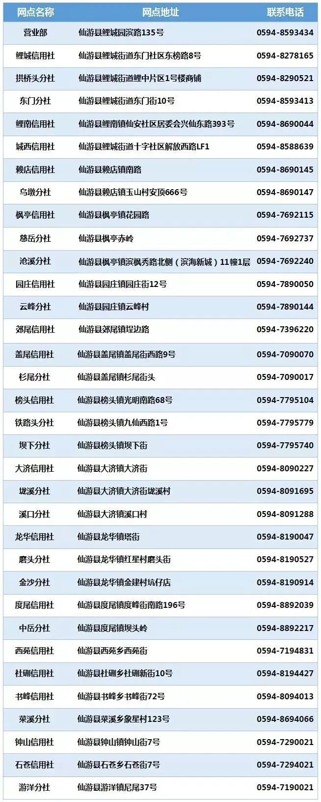 仙游农村信用社各营业网点联系方式
