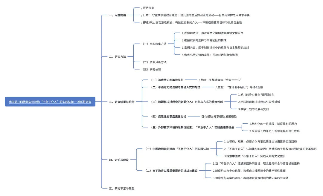 《幼儿园保育教育质量评估指南》里明确提出“认真观察幼儿在各类活动中的行为表现并做必要记录,根据一段时间的持续观察,对幼儿的发展情况和需要做出客观全面的分析,提供有针对性地支持。不急于介入或干扰幼儿的活动。”可“不急于”这个度始终是一线教师难以拿捏的模糊边界。每个人的性格、所处的教学情境不同,对“急与不急”的判断标准也千差万别,而这篇质性研究用扎实的研究过程拨开了迷雾,给了一线教师极具实操性的启发。刚开始阅读时,摘要中“教师如何把握介入时机与方式,以及他们因何而急等问题的答案仍似在薄雾之中”这句话就瞬间勾起了我的好奇心。细细品读后,我不仅被研究清晰严谨的思路、细致周全的研究伦理打动,更从这一小切口的深度研究中找到了一线幼教实践的共鸣,也对“不急于介入”有了更透彻、更贴合实际的理解。