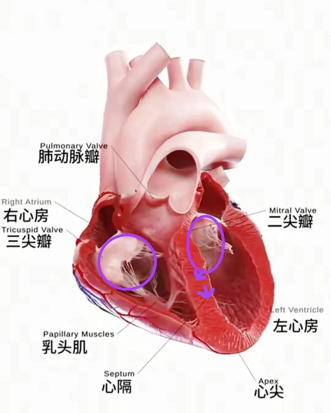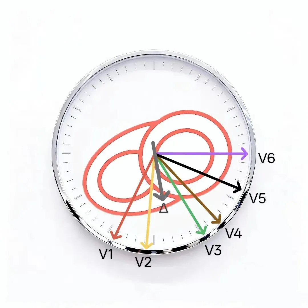 从额面观察心脏相关结构的位置,可见二尖瓣环前侧在心室偏上方,二尖瓣后侧在心室偏下方。所以,当房室旁道位于二尖瓣环后侧,激动心室的顺序便是:1.向上——δ波极性在下壁导联表现负向为主;2.向前——δ波极性在胸导联正向为主。