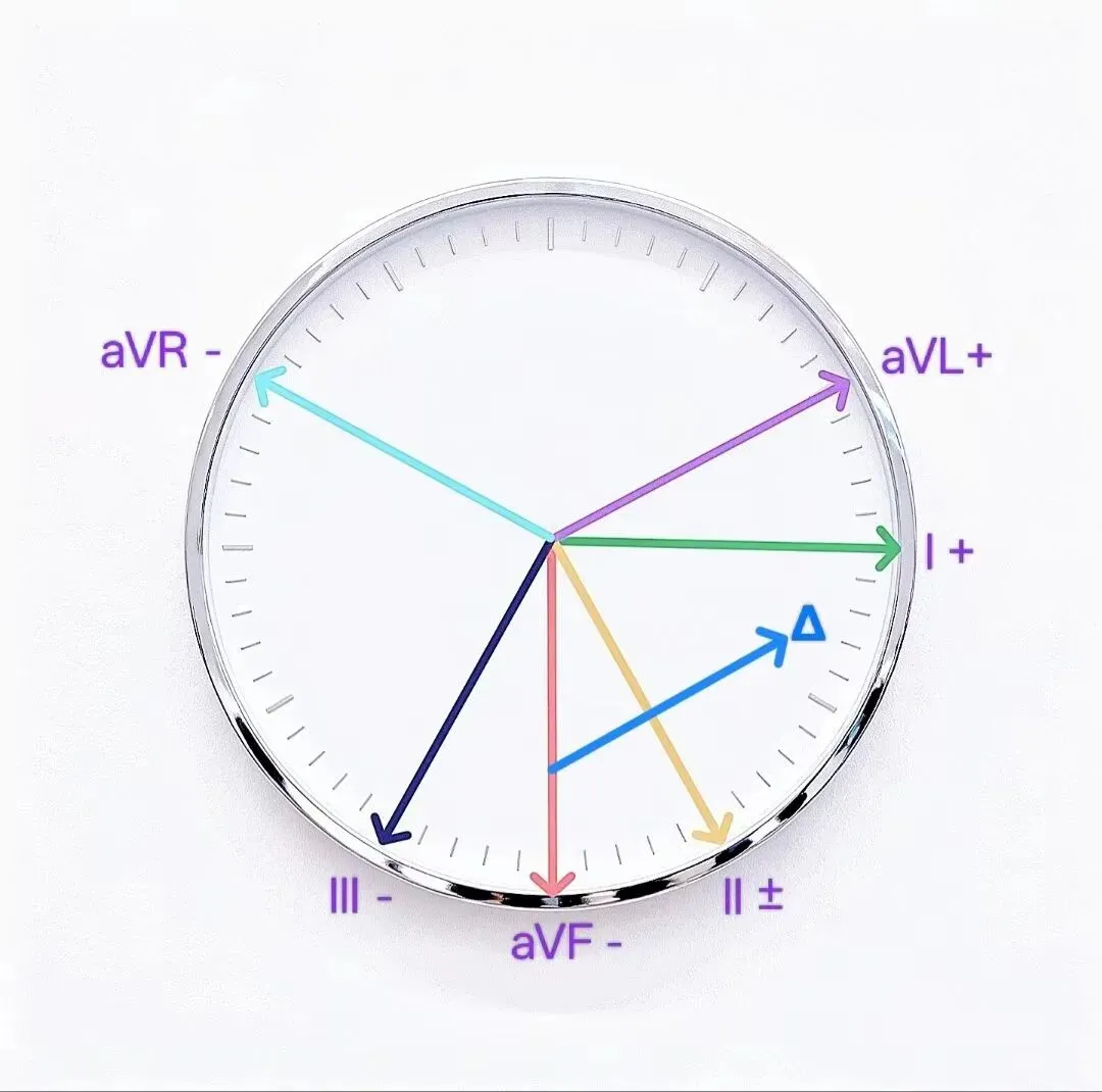 因为Ⅱ导联的δ波极性±不明显,其QRS宽度为最窄,可以理解为旁路激动心室的额面向量与Ⅱ导联形成的角度最接近90°角。aVL的δ为正,心室预激的起始向量是向上,说明旁路位置偏下。