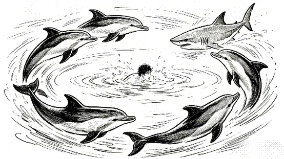 ·释义:海豚和鲨鱼是天然的仇敌。