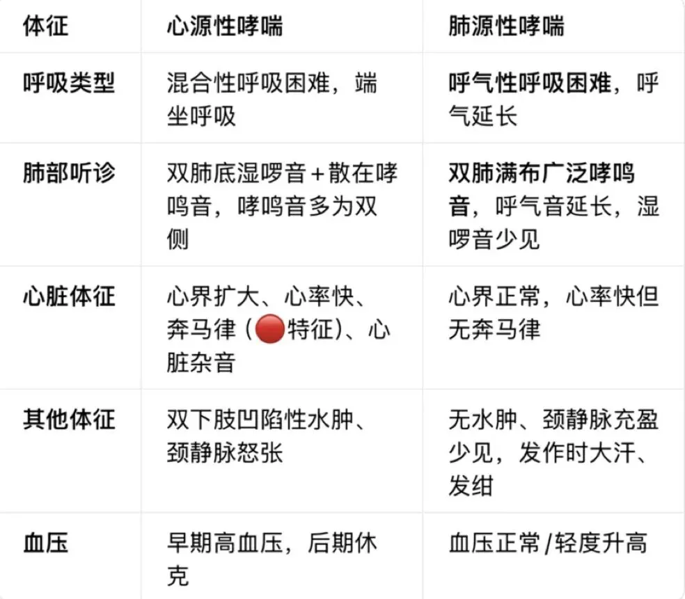 ✅ 重点标注:呼气性呼吸困难、双肺满布以呼气相为主的哮鸣音、呼气相延长,严重时出现三凹征,心脏查体无明显异常,无水肿