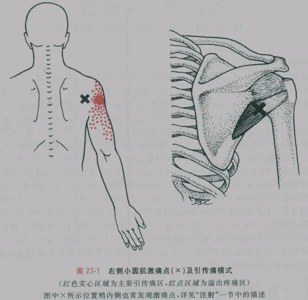 疼痛集中在肱骨三角肌粗隆[deltoid tubercle of the humerus]上的三角肌附着近端。因此虽然远在肩峰下囊下方,但由于疼痛可明确定位,而且位置很深,患者很容易将其误认作“滑囊炎”。疼痛如果遍布上臂和肩后,则很少是仅由小圆肌激痛点引起的。Bonica 和 Sola 曾描绘了后三角肌区域内一种更广泛的疼痛分布。