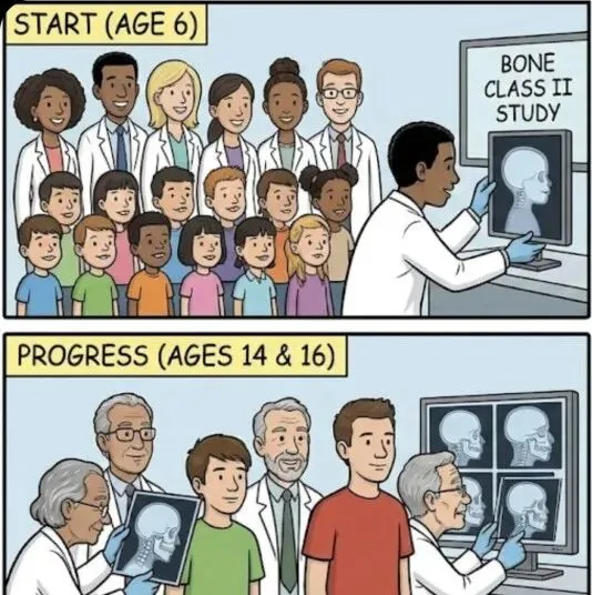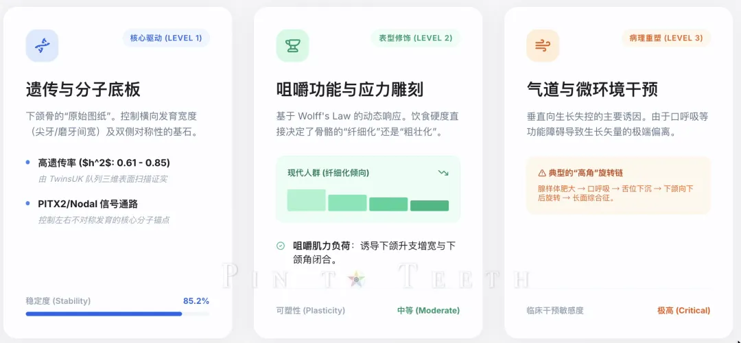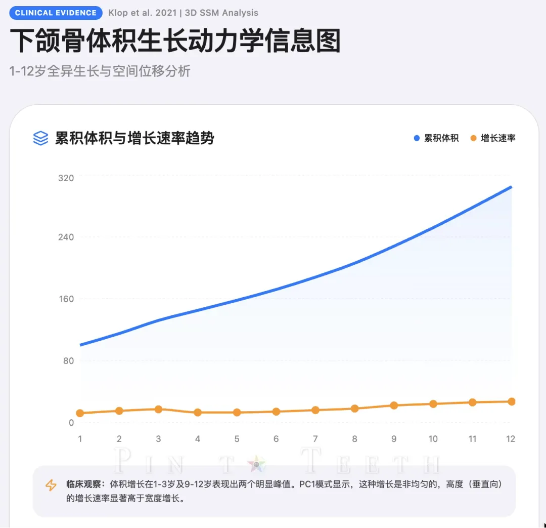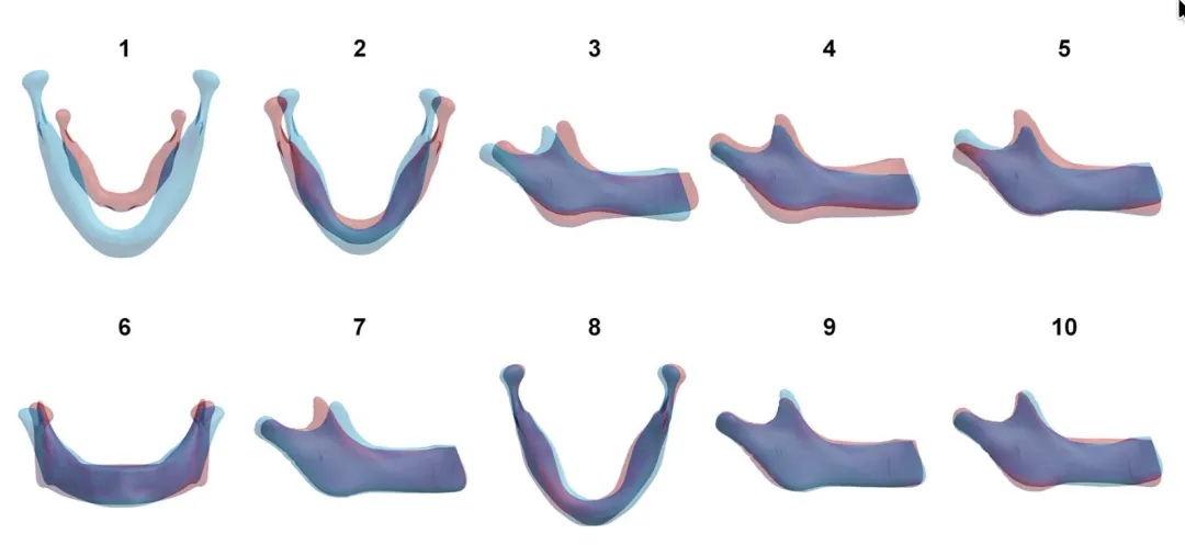 当我们评估下颌骨生长潜力时,我们习惯盯着头侧片上的Co-Gn、SNB和下颌平面角。 但经典的二维影像,真的能告诉我们全部真相吗? 近年来,随着几何形态测量学的兴起,关于下颌骨生长的研究维度已被推向了三维层面。本篇结合Bone Reports (2022) 、 Scientific Reports(2021) 以及 Computers in Biology and Medicine (2024) 发表的三篇SCI的学习笔记,重新梳理下颌骨生长的底层逻辑。👉 核心观点:生长是持续的,且具有显著的差异性生长速率。对于临床医生而言,准确预判下颌骨的生长潜力是制定矫治计划——尤其是II类错𬌗功能矫形——的关键。2D视角的证据:根据McNamara的经典纵向研究,有效下颌长度(Co-Gn)从替牙期到恒牙期呈现持续增长态势。青春期前下颌骨年平均增长量约为2mm;而在生长高峰期(CVM分期处于CS3-CS4阶段),男性患者的年生长量可激增至3mm以上 。现代几何形态测量学通过对874例1-12岁儿童颌骨样本的主成分分析(PCA)证实:解释度最高的形态变异(PC1,占比78%)与年龄呈现极强正相关。这表明, 尺寸持续性的增大是下颌骨发育的主旋律。📝 临床Tip: 也许在生长高峰期利用功能矫治器这一顺风车,能最大化骨骼效应;但下颌骨生长发育是持续存在的。👉 核心观点:生长是非均一的,伴随着复杂的空间旋转与表面改建。下颌骨的生长绝非简单的“等比例放大”,而是高度、宽度、长度的三维协同变化。3D分析显示,下颌骨在垂直向(升支高度)的生长量最为显著,其次是矢状向(体部长度),横向宽度变化最小。混合牙列期: Pg点平均位于N垂线后方 -8至-6mm;这种变化不仅源于髁突向后上的生长带来的下颌整体前下位移,也源于颏部表面的骨沉积。随着升支后缘的骨沉积和前缘的骨吸收,下颌角逐渐变小,形态由钝变锐。这也是面部轮廓从圆润走向立体的解剖学基础。我们在临床上经常见到:同样是生长高峰期,High-angle(高角)和Low-angle(低角)病例的下颌骨表现截然不同。PCA分析为我们量化了这种差异:📐长宽比差异: 对应不同的面型(开张型 vs. 聚合型);这些形态特征更多受遗传控制。这意味着,对于严重的高角或骨性畸形,我们不能寄希望于“生长”来完全修正其原本的骨骼蓝图。然而。在正畸临床、颅面外科学和人类学鉴定中,一个普遍且极具挑战性的现象是:即便是年龄相同、性别相同,甚至骨龄发育阶段相似的患者,其下颌骨的三维绝对尺寸、下颌平面角开度、髁突形态、甚至是左右侧的对称性,也可能呈现出天壤之别的“同龄异型”现象 。下颌骨并不是一台严格按照预设时间表精密运转的3D打印机,其最终呈现的面部三维表型,是基因底色、长期的机械功能适应以及微环境外部干预之间错综复杂、相互博弈的最终结果 。理解证据的来源,有助于我们更客观地看待教科书结论。📐经典基石:二维头影测量(2D Cephalometrics) 基于二维参数测量分析,McNamara、Ricketts、Steiner以及Tweed等正畸先驱们,通过对大量特定种族样本的测绘,构筑了庞大且影响深远的正常值数据库(Norms),这些分析法至今仍被奉为正畸诊断的“金标准” 。📐前沿验证:三维统计形状模型(3D Statistical Shape Models) 以Klop等人的研究为代表。利用CT数据 + 普氏叠加+ 主成分分析(PCA),捕捉到了传统头影测量无法测量的曲面变化和体积分布 ,让我们看到了更真实的生长全貌。🦷 重温3D视角下的下颌骨生长发育规律,启示在于:把握时机: 下颌骨生长虽然具有明显的阶段性加速 ,但是从出生后一直持续存在。解除干扰,释放生长潜力也具有临床意义。理解重塑: 关注髁突生长带来的下颌骨位置变化,同时不要忽视表面改建对面型的微调作用。尊重差异: 承认 基因蓝图 (生物型)的限制性。对于不同垂直骨面型的患者,生长预测应是个性化的,治疗目标也应设定在生理限度之内。A Three-Dimensional Statistical Shape Model of the Growing Mandible. Scientific Reports (2021): 18843. https://doi.org/10.1038/s41598-021-98421-x.