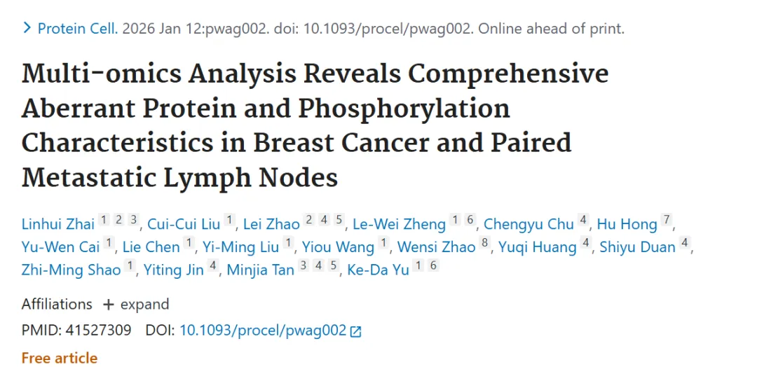 在此背景下,蛋白质组学与磷酸化蛋白质组学等多组学技术逐渐成为解析肿瘤生物学行为的重要手段。但针对乳腺癌原发肿瘤与其配对转移性淋巴结的系统性多组学研究仍然相对有限,淋巴结转移过程中蛋白层面的动态重塑及其潜在调控机制尚未得到充分阐明。2026年1月发表于 Protein& Cell1的研究Multi‑omics Analysis Reveals Comprehensive Aberrant Protein and Phosphorylation Characteristics in Breast Cancer and Paired Metastatic Lymph Nodes2 通过多组学整合分析阐述乳腺癌早期转移分子基础,并为未来生物标志物发现及靶向治疗策略提供理论依据。