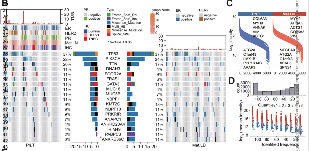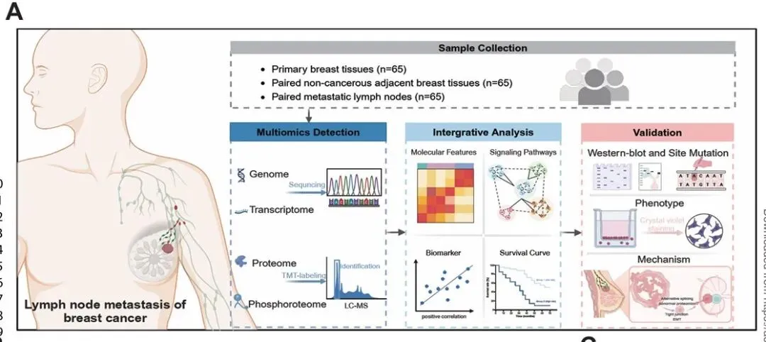 该研究基于严格配对的人体临床样本,纳入 65 例乳腺癌患者,每例均采集原发肿瘤、配对转移性淋巴结及癌旁组织,所有样本经病理学确认并满足肿瘤细胞比例要求。研究整合全外显子组测序(WES) 和 RNA‑seq 数据,系统分析体细胞突变、拷贝数变异、基因表达及可变剪接特征;以及基于等标记串联质量标签(TMT) 的整体蛋白质组和磷酸化蛋白质组分析。同时,通过多组学整合、生物信息学分析及功能实验(细胞侵袭、Western blot、CD8⁺ T 细胞共培养杀伤实验),从分子机制层面系统解析乳腺癌淋巴结转移的关键驱动过程。