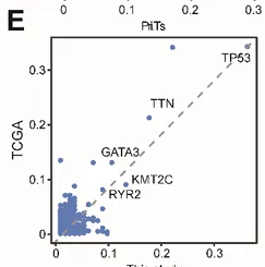 与 TCGA 数据对比验证表明,本研究中各基因突变频率具有良好的外部一致性(图 S1E)
